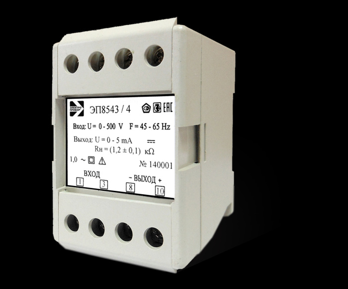 Преобразователь измерительный ЭП8543 - это устройство для линейного преобразования напряжения переменного тока в унифицированный выходной сигнал постоянного тока. Носителем информации есть среднее значение выходного сигнала. Преобразование производится по среднему значению входного сигнала. В преобразователе обеспечивается гальваническое разделение входных и выходных цепей.