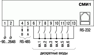 RS-232, RS-485 | 1 × RS-232 (RJ12), 1 × RS-485 - для подключения устройств и конфигурации прибора Сигналы RS-232 – RxD, TxD, GND, сигналы RS-485 – A, B Гальваническая изоляция между схемой прибора и интерфейсом RS-485 составляет 1500 В. Поддерживаемые скорости: 2400, 4800, 9600, 14 400, 19 200, 28 800, 38 400, 57 600, 115 200 бит/c Поддерживаемые протоколы: Modbus RTU (Master/Slave), Modbus ASCII (Master/Slave), ОВЕН (Master/Slave) | |