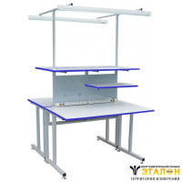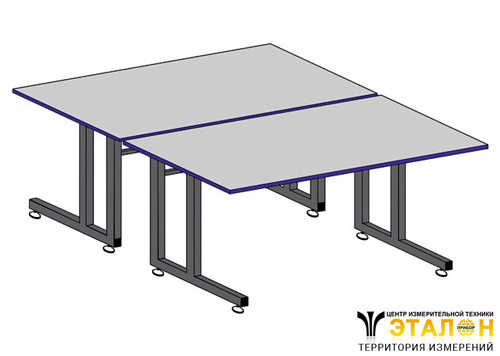 2 стола рабочих объединённых в "ОСТРОВ". Антистатическое покрытие. Металлический разборный каркас из трубы 40х40. Цвет светло-серый. Порошковая краска. Нагрузка 300 кг. Регулируется стол по высоте от 730 до 1030 мм.