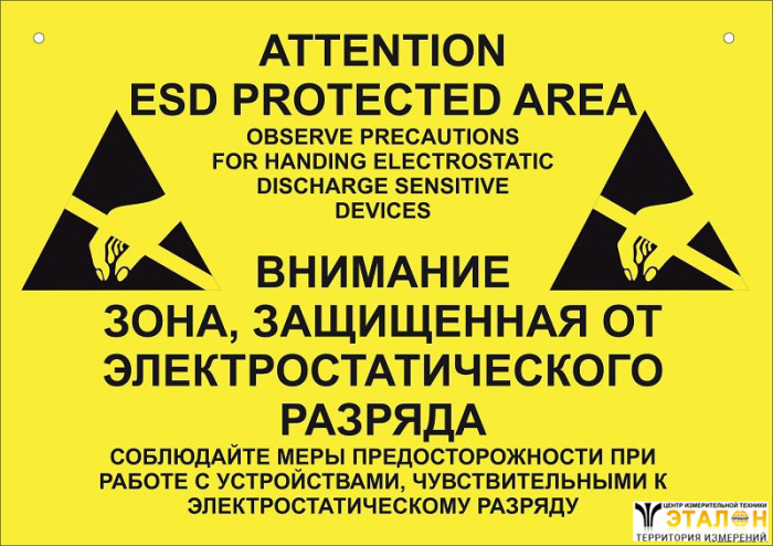 1ая сторона: ATTENTION! ESD PROTECTED AREA (ВНИМАНИЕ! ЗОНА ЗАЩИЩЕННАЯ ОТ СТАТИЧЕСКОГО РАЗРЯДА) на желтом прямоугольнике формата А-4 для размещения на входе в EPA зону.