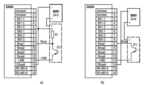 Подключение к входу датчиков, имеющих на выходе транзистор p-n-p типа: а) активный датчик; б) пассивный датчик