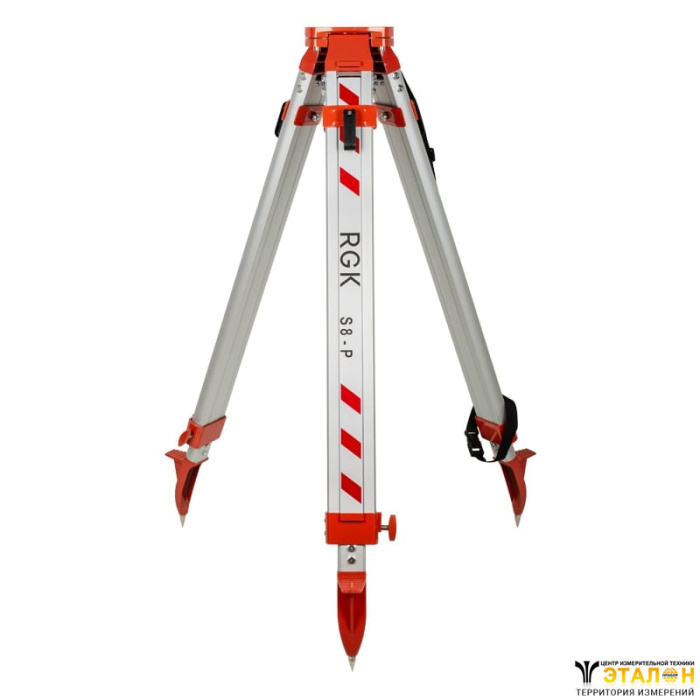 Специалист может глубоко углубить в грунт острые металлические наконечники ножек при помощи прочных упорных площадок в целях повышения устойчивости конструкции. Материал корпуса геодезического штатива RGK S8-P - алюминий - достаточно прочен и хорошо противостоит коррозии. В собранном состоянии компактная тренога фиксируется ремнем.