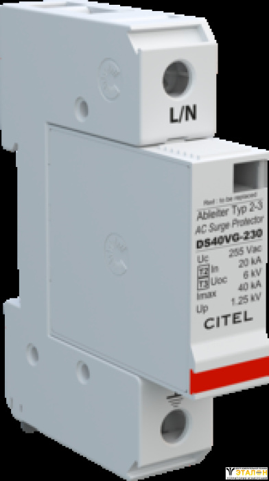 УЗИП DS40VG Тип 2 +3 AC, в основе технология VG, разработанная CITEL, чтобы подавить ток утечки и рабочее напряжение обеспечивая максимальную пропускную способность и надежный уровень защиты. Электрическая схема имеет разъединитель и соответствующий индикатор ..