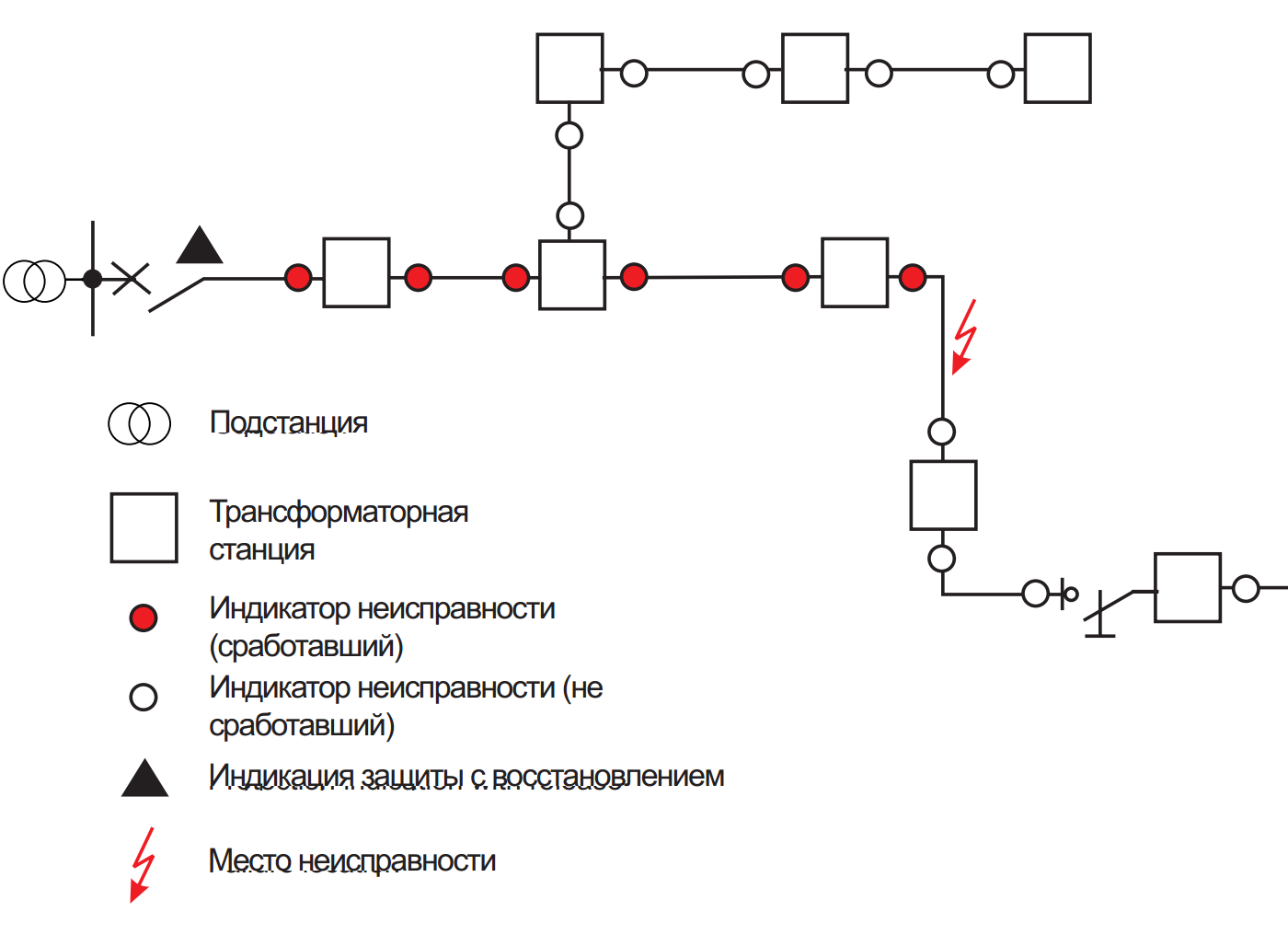 Схема работы устройств приведена на рисунке ниже. Участок, содержащий повреждение, вызывающее протекание аварийного тока в сети, располагается между последним сработавшим и первым не сработавшим индикатором короткого замыкания.