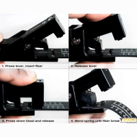 FC-220 подходит для работы с голым волокном 125 мкм. и с волокнами в буфере 250 и 900 мкм. Чтоб произвести скол, нужно опустить карбидный нож на волокно и придавить, после этого изогнуть гибкую площадку, на которой лежит волокно пока оно не треснет в месте насечки. Длина скола составляет 2 - 20 мм от места зачистки буфера. Стандартный нож из карбидной стали будет выполнять до 6000 сколов.