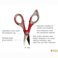 Предназначены для разрезания кевларовой ткани (Kevlar®) и кевларовых нитей при монтаже оптического кабеля или производстве патч-кордов. Также пригодны для резки изоляции кабеля, кабельных стяжек, пластика и других материалов. Ножницы изготовлены из высоко углеродистой нержавеющей стали с твердостью 58-60 единиц по шкале Роквелла, что является максимальным значением твердости для ножа, так как при более высоких значениях лезвие становится, хоть и тверже, но более хрупким. Одно лезвие ножниц имеет серрейторную (зазубренную) заточку, чтоб удерживать материал при разрезании и не допустить его выскальзывания. Инструмент оснащен регулировочным винтом, закрытым защитным колпачком.