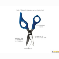 Предназначены для тяжелых условий эксплуатации. Могут использоваться для резки медного и алюминиевого провода, пластика, тканей, кевларовых нитей и т.д. Ножницы изготовлены из высоко углеродистой нержавеющей стали. Лезвие имеет серрейторную (зазубренную) заточку и с внешней стороны имеет две V-образные канавки для снятия изоляции с проводов от 0.5 до 1 мм (18-20 и 22-24 AWG). Инструмент оснащен регулировочным винтом, закрытым защитным колпачком.