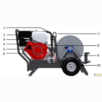 1- рычаг уровня 2- глушитель шума 3- дроссельная регулировка 4- дросель/клапан топлива 5- ручка стартера | 6- указатель уровня масла 7- транспортное ухо 8- вкл/выкл 9- барабан с тросом 10- фиксатор | |