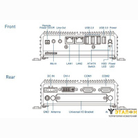 Компактный компьютер, Onboard Intel® Celeron® J1900 1x DVI-I, 2x GbE LAN, 2x COM, 1x USB3.0, 3x USB2.0, 1x Mic-in, 1x Line-out, 1x Universal I/O Bracket 2x Full-size Mini-PCIe, 1x SIM Socket (Internal), 1x CMI (Combined Multiple I/O) Interface