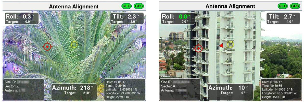 Для начала работы с прибором, в его настройках нужно указать координаты и высоту установки второй антенны, на которую монтажник хочет настроить свою. После чего на экране прибора появятся два индикатора в виде "прицела", красный индикатор - это удалённая антенна, жёлтый индикатор - это своя антенна, на которой в данный момент установлен RF Vision. Чтобы точно выставить направленность антенн друг на друга, нужно совместить оба индикатора, регулируя наклон и разворот настраиваемой антенны с помощью её регулировочного крепления. Когда оба индикатора сойдутся правильно, они станут зелёными.