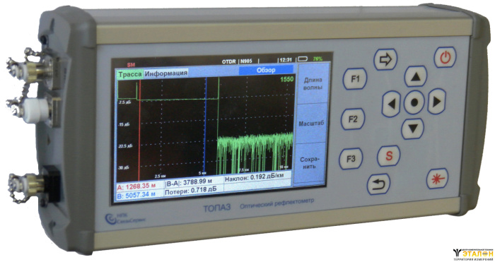 Универсальный оптический рефлектометр ТОПАЗ-9400-A-31-49-55-PMH со встроенным измерителем мощности, источником излучения и визуальным локатором дефектов волокна служит для проведения паспортизации, тестирования и поиска дефектов на всех видах оптоволоконных линий от локальных сетей и сетей доступа до городских и магистральных сетей. Благодаря большому динамическому диапазону и встроенным измерителю мощности и источнику излучения прибор эффективен при тестировании PON.