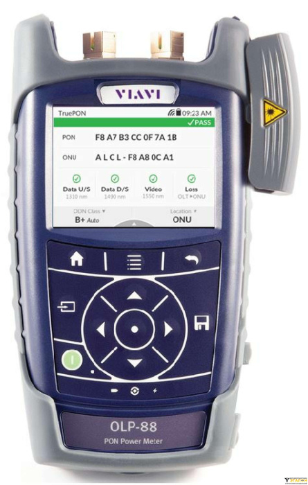VIAVI SmartClass Fiber OLP-88 работает на длинах волн 1310/1490/1550 нм и подключается в разрыв линии проводя трафик через себя. В реальном режиме времени OLP-88 измеряет вносимые потери, уровни мощности нисходящего и восходящего потоков, определяет класс сети ODN (Optical Distribution Network), а также идентифицирует терминалы OLT (Optical Linear Terminal) и ONT (Optical Network Terminal) на стороне провайдера и клиента, выявляет неисправные ONT/ONU (Optical Network Unit), создающие проблемы в обслуживании сети.