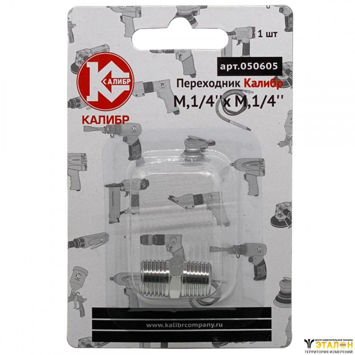 Переходник Калибр M1/4'' x M1/4''. Предназначен для соединения участков пневмомагистрали во время монтажа. Обеспечивает переход с внутренней резьбы на наружную.
