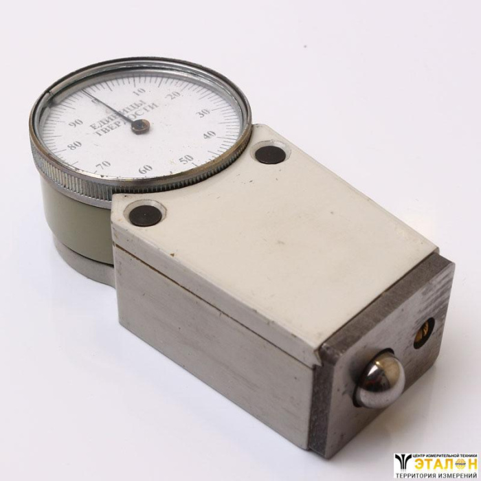 После снятия твердомера с исследуемой поверхности индентор пружиной возвращается в исходное положение, а пружина в индикаторе (на рис. не показана) удерживает шток и стрелку в прежнем положении — твердомер зафиксировал измеренное значение твердости. Для сброса показаний достаточно нажать на кнопку сброса показаний, образованную верхним концом штока индикатора.