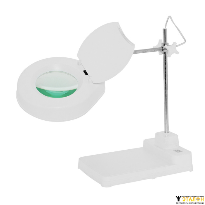 Лампа c стеклянной увеличительной линзой. Штатив лампы можно поворачивать в любом направлении.