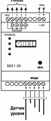 Контроль уровня осуществляется при помощи 5-ти электродного кондуктометрического датчика, четыре сигнальных электрода которого расположены в резервуаре на заданных по условиям технологического процесса отметках: уровень 1, уровень 2, уровень 3, уровень 4– и подключаются ко входам прибора 1–4. Питание датчика уровня осуществляется переменным напряжением.