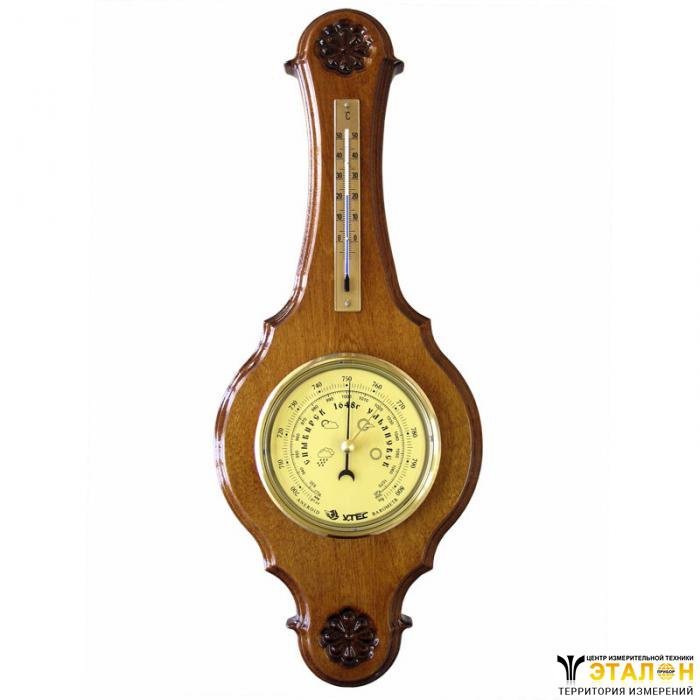 Модель: БНЖТ "Банджо". Барометр настенный бытовой. Барометр предназначен для ориентировочных наблюдений в жилых помещениях за изменением атмосферного давления в географических районах, расположенных не выше 300 метров над уровнем моря. В конструкции барометра предусмотрены термометры биметаллический стрелочный или жидкостный стеклянный, измеряющие температуру воздуха, а также гигрометр для измерения влажности воздуха.