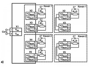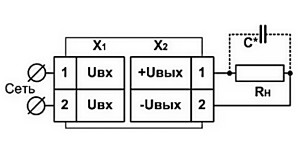 Примечание. При длине проводов между блоком и нагрузкой более 1 м и отсутствием на входе нагрузки входных конденсаторов рекомендуется параллельно нагрузке подключить керамический конденсатор емкостью не менее 0,1 мкФ и напряжением ≥1,5 Uвых применяемого блока.