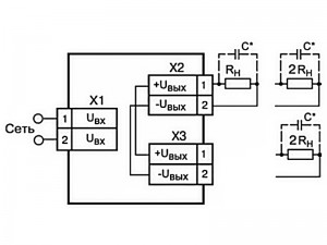 Примечание. При длине проводов между блоком и нагрузкой более 1 м и отсутствием на входе нагрузки входных конденсаторов рекомендуется параллельно нагрузке подключить керамический конденсатор емкостью не менее 0,1 мкФ и напряжением ≥1,5 Uвых применяемого блока.