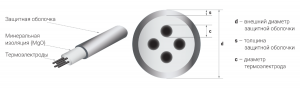 КТМС – Кабель Термопарный с Минеральной изоляцией в Стальной оболочке. Конструктивно КТМС состоит из гибкой металлической трубки, в которую помещены термоэлектроды (см. рис.). Пространство между термоэлектродами и стальной жаростойкой оболочкой заполнено плотной дисперсной минеральной изоляцией – оксидом магния.