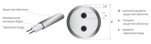КТМС – Кабель Термопарный с Минеральной изоляцией в Стальной оболочке. Конструктивно КТМС состоит из гибкой металлической трубки, в которую помещены термоэлектроды (см. рис.). Пространство между термоэлектродами и стальной жаростойкой оболочкой заполнено плотной дисперсной минеральной изоляцией – оксидом магния.