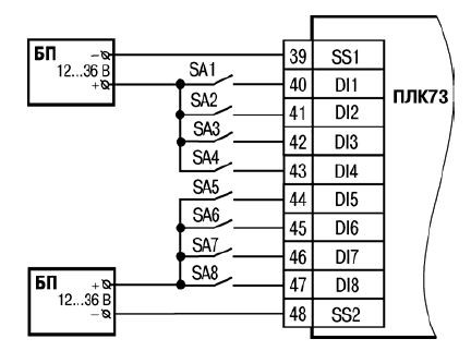 Схема расположения и назначения клемм на ПЛК73 (вид на заднюю стенку корпуса)