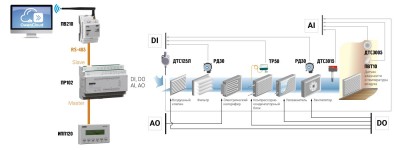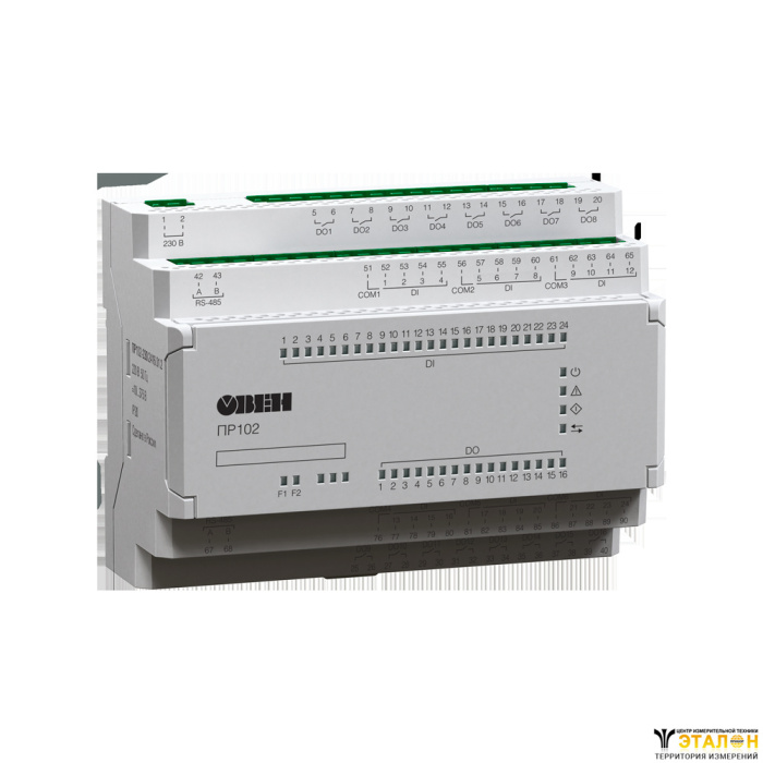 ОВЕН ПР102 –программируемое реле для управления вентиляцией, отоплением, насосами и др. Главным преимуществом прибора является широкий функционал и высокая плотность каналов ввода/вывода. В корпусе 7DIN располагается 40 аналоговых и дискретных входов/выходов. Для расширения собственных входов/выходов предусмотрено подключение по внутренней шине модулей расширения ПРМ. В ПР102 может быть до 2-х интерфейсов RS-485 на борту: для управления устройствами по сети и передачи данных на верхний уровень. Написание алгоритма осуществляется пользователем на языке FBD с помощью бесплатной среды программирования OwenLogic. Загрузка алгоритма производится с помощью кабеля microUSB.