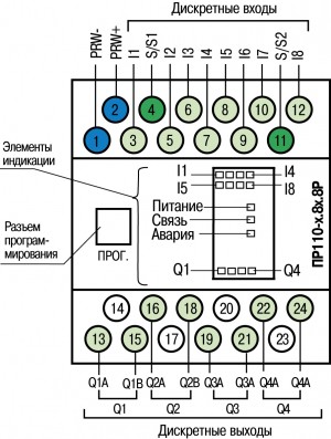 Расположение контактов и элементов индикации в приборах ПР110-ххх.8Дх.4Р-х