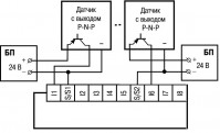 Схема подключения трехпроводных дискретных датчиков, имеющих выходной транзистор p-n-p–типа с открытым коллектором