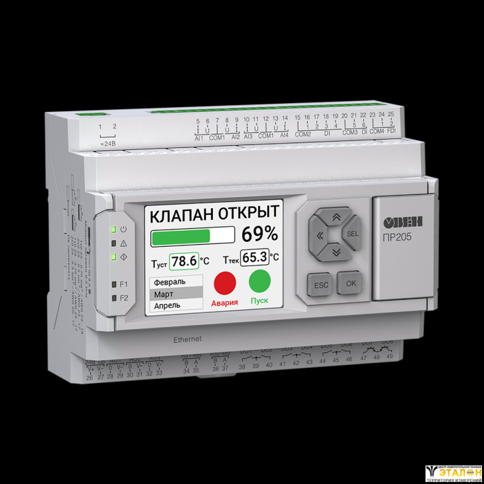 ПР205 – новое программируемое реле с графическим дисплеем и Ethernet. Прибор сочетает в себе оптимальную конфигурацию аналоговых и дискретных входов/выходов для управления системами вентиляции, отопления, кондиционирования и др. При необходимости количество входов/выходов можно увеличить с помощью модулей расширения ПРМ.