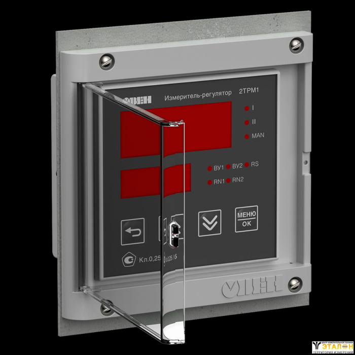 Конструкция рамки содержит прозрачную дверцу, которая может открываться на угол до 100 градусов и фиксироваться в открытом положении. Прозрачная дверца осуществляет дополнительную защиту приборов от внешних механических воздействий, защищает лицевую панель от попадания брызг, загрязнений, значительно увеличивает срок службы гибко-пленочной клавиатуры прибора.