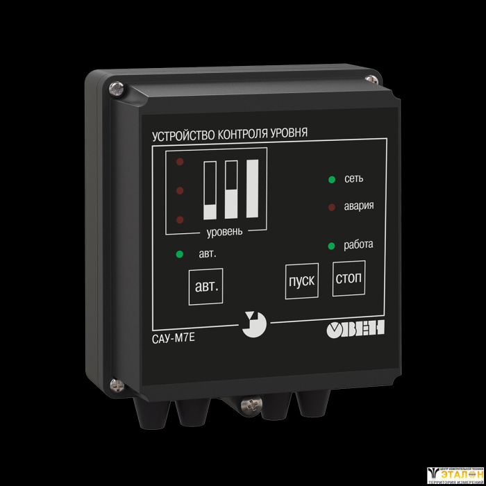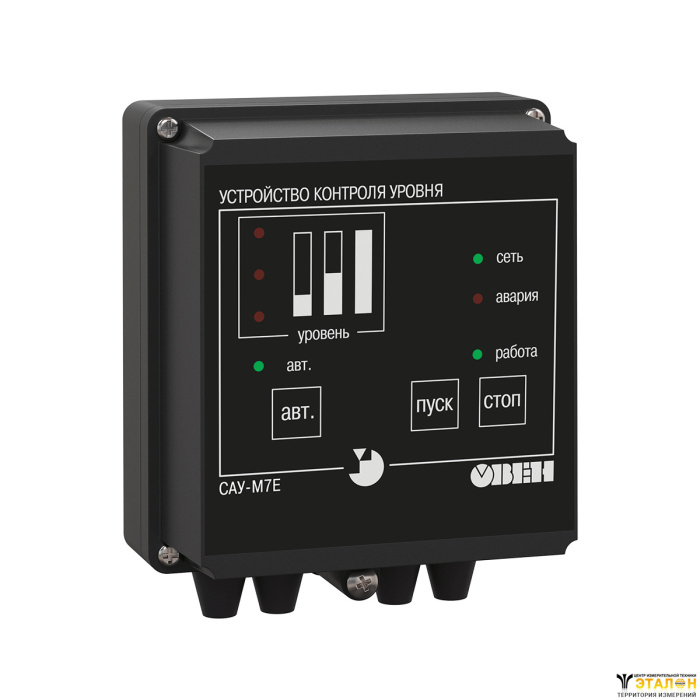 Прибор САУ-М7Е обеспечивает контроль уровня жидких или сыпучих материалов в резервуаре. Может управлять заполнением, осушением или поддержанием уровня в отопительных котлах, водонапорных башнях, зернохранилищах и т.п.