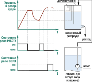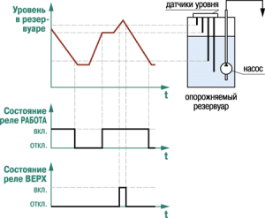 • опорожнение резервуара без гистерезиса (реле включается после замыкания датчика нижнего уровня, а выключается при его размыкании).