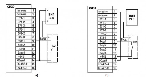 Подключение к входу датчиков, имеющих на выходе транзистор p-n-p типа: а) активный датчик; б) пассивный датчик