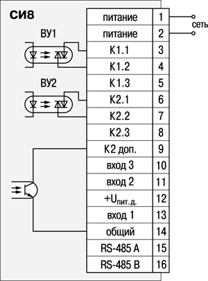 Схема подключения прибора СИ8 с оптотранзисторным выходом (выход К)
