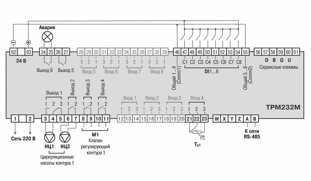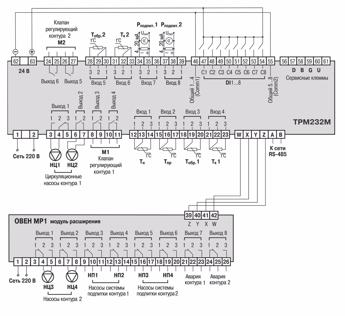 ОВЕН ТРМ232М – контроллер для регулирования температуры в системах отопления, ГВС и управления насосными группами. Предназначен для управления ИТП и ЦТП жилых и производственных зданий. В комплекте с датчиками и исполнительными механизмами ОВЕН ТРМ232М обеспечивает контроль и регулирование температуры и давления, управляет циркуляционными насосами контуров, насосами ХВС и контуров подпитки.