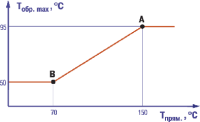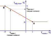 Контроль температуры обратной воды осуществляется по графику Тобр.max = f(Tнаруж.) или Тобр.max = f(Tпрям.), в зависимости от контролируемого на входе параметра.