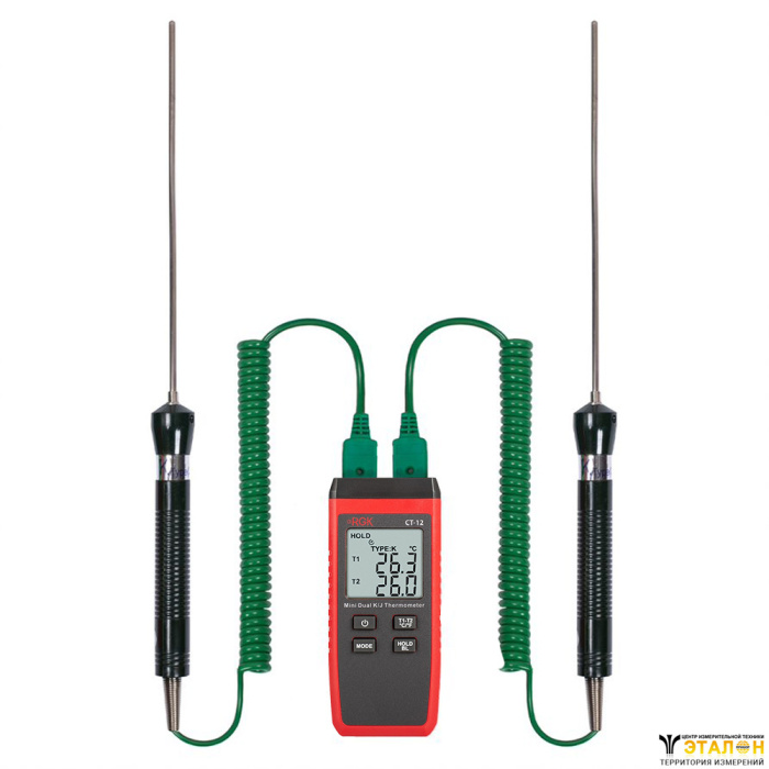 Контактный термометр RGK CT-12 с погружными зондами температуры TR-10W - это надежный и точный прибор для измерения температуры в диапазоне от -40°С до +400°С с комплектной термопарой. Погрешность при этот составляет не более ± 1,5 °C. Главное преимущество этой модели - 2 гнезда для подключения выносных датчиков с функцией определения разности между каналами.