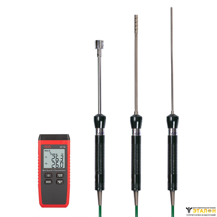 Контактный термометр RGK CT-12 с зондом температуры воздуха TR-10A, поверхностным зондом TR-10S и погружным зондом температуры TR-10W с поверкой - это надежный и точный прибор для измерения температуры в диапазоне от -40°С до +500°С с комплектной термопарой. Погрешность при этот составляет не более ± 1,5 °C. Главное преимущество этой модели - 2 гнезда для подключения выносных датчиков с функцией определения разности между каналами.