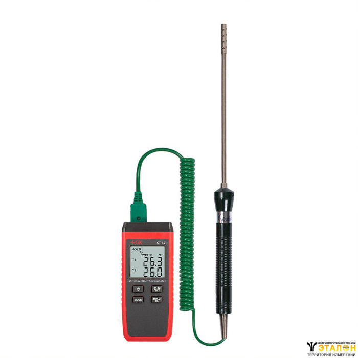Контактный термометр RGK CT-12 с зондом температуры воздуха TR-10A - это надежный и точный прибор для измерения температуры в диапазоне от - 40 °С до + 260 °С с комплектной термопарой. Погрешность при этот составляет не более ± 1,5 °C. Главное преимущество этой модели - 2 гнезда для подключения выносных датчиков с функцией определения разности между каналами.