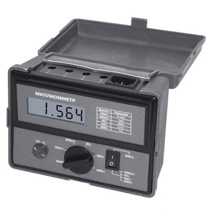 Цифровой миллиомметр АМ-6000: измерение сопротивлений 0,1 мОм ... 2 кОм, точность 0,75%, дополнительные функции: возможность точных измерений по 4-х проводной схеме; питание 220 В, габариты 160х120х85 мм, вес 0,68 кг.