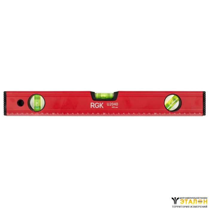 Линейка с ценой деления шкалы 1 мм сделает удобной разметку поверхностей. Подписи и отметки шкалы белого цвета на строительном уровне RGK U2040 выполнены методом гравировки и не истираются при контакте с такими поверхностями, как бетон или дерево.