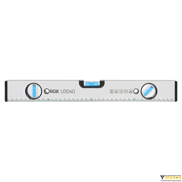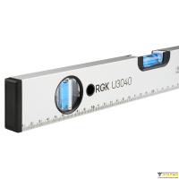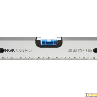 Корпус представляет собой прямоугольный профиль, изготовленный из алюминиевого сплава методом экструзии, благодаря чему не конструкция нуждается в дополнительной фрезеровке для выравнивания. Торцевые заглушки из ударопрочного пластика предохраняют края рабочих поверхностей от деформации при случайных падениях. На боковую грань корпуса нанесена миллиметровая шкала, благодаря чему инструмент можно использовать для измерений и разметки, как линейку. В уровне RGK U3040 используются ватерпасы с прозрачной колбой и жидкостью синего цвета, пузырек в которых хорошо различим даже при слабом освещении.