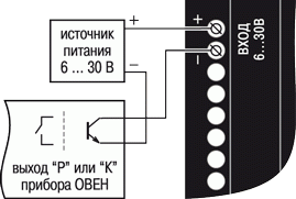 • 6...30 В (выход «К» или «Р» регулятора ОВЕН с внешним источником питания)