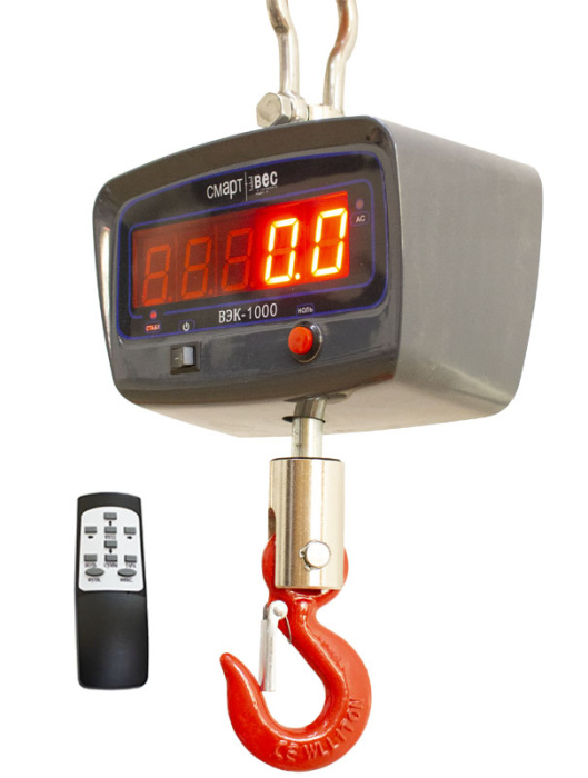 Крановые весы ВЭК-1000 производства ООО «СмартВес». Прочный пластиковый корпус, большой яркий дисплей, поворотный крюк и привлекательная цена – эта модель является лучшим выбором до одной тонны уже не первый год. Для удобства работы и настройки весы комплектуются пультом. Внесены в Госреестр, поставляются с первичной поверкой.*Вы можете купить более дешевую модель крановых весы до 1 тонны ВЭК-1000 мини за 14 000 р.