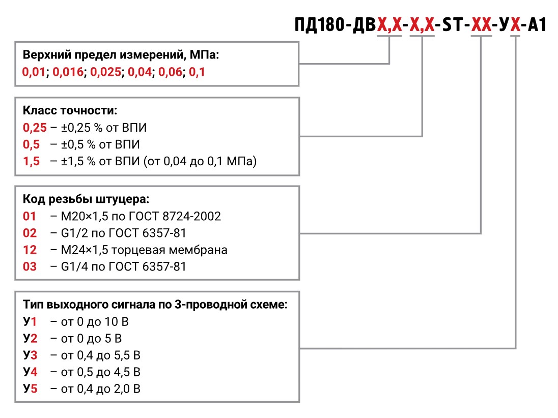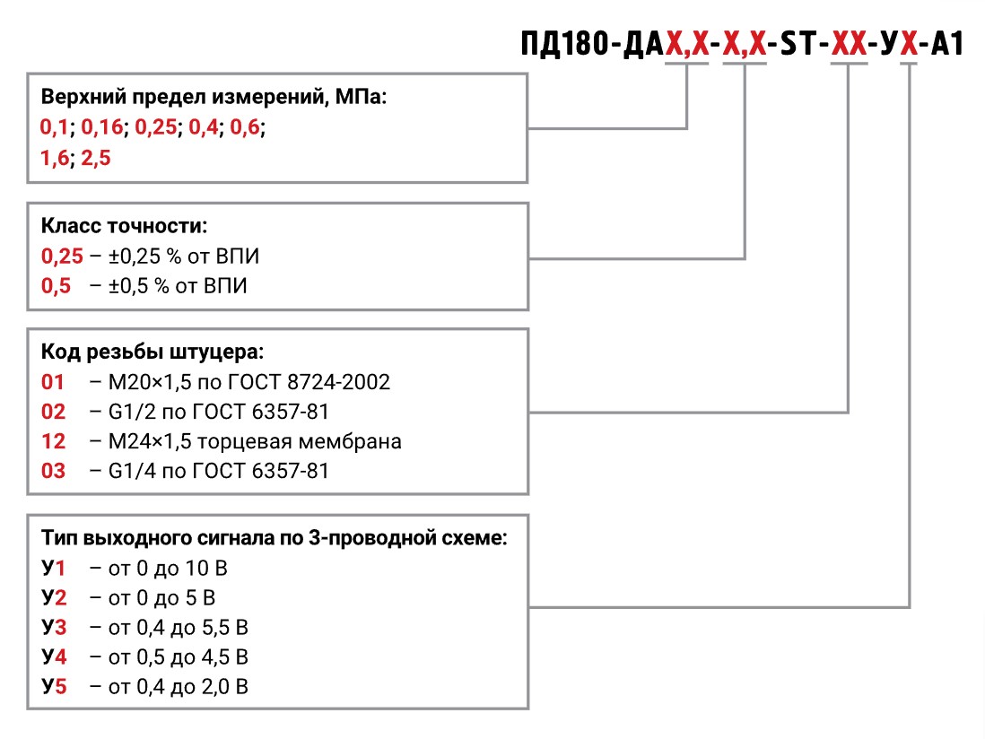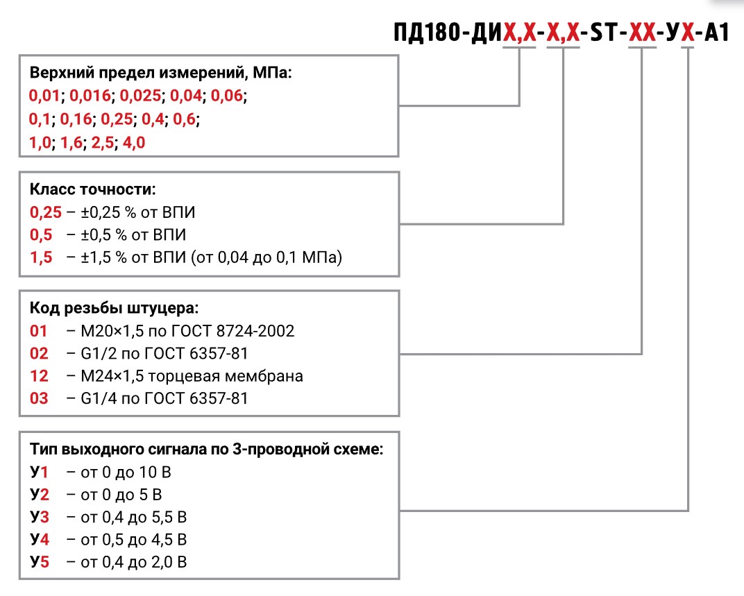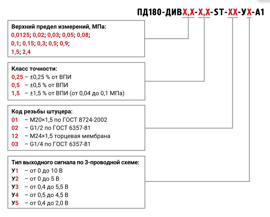 - Тип измеряемого давления – избыточное (ДИ), вакуумметрическое (ДВ), избыточно-вакуумметрическое (ДИВ).